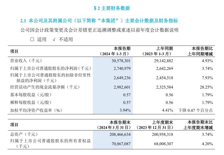 中兴通讯股份有限公司今晚公布 2024 年第一季度报告,数据显示,中兴通讯该季度营业收入 305.78 亿元,同比增加 4.93%;归属于上市公司普通股股东的净利润为 27.41 亿元,同比增长 3.74%。
