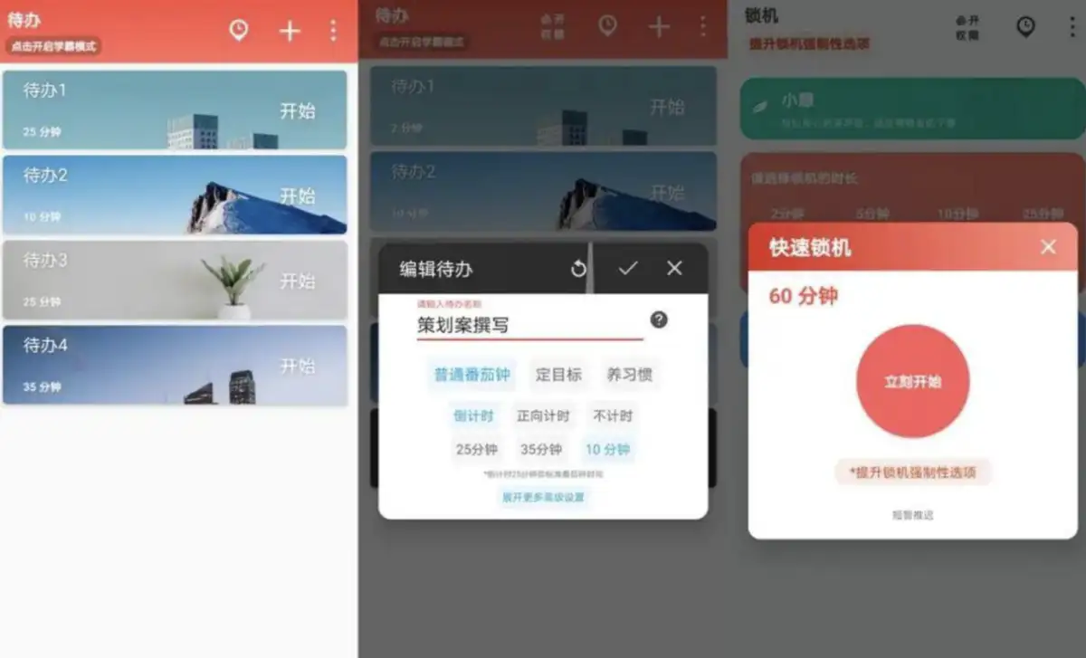 TO DO是一款时间管理App,是治疗拖延症患者必备神器,简单来说就是用来监督自己完成任务,从而养成良好的习惯。优点:除了常见的任务管理,它能让手机一秒变成“没用的砖头”的锁机功能,锁机后手机不能开机解锁,可以很好地防止自己在上班时间沉迷摸鱼,强制自己好好干活。