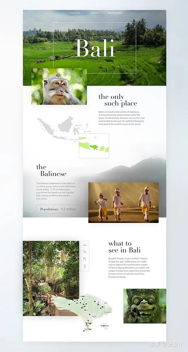 最后一个网站建设案例,我们一起来看一下,大家有没有发现,网站界面当中元素越少,对齐的方式越少,颜色搭配越少,看起来越专业,非常干净简洁,这个这个案例非常优秀,如果是用来参与一些比赛的话,应该是可以入围,可以获奖的。我们看一看有哪些点值得学习,首先是班的区域,一个远远景的背景图渲染这个。巴黎巴黎的这一个氛围,就网站主题的氛围,接下来是有一个猴子的一个小的图片压在band上面,再下边,就是第二篇的文字部分,画杭州没有对齐,跟下面正文对齐,这种对齐没有凌乱,非常好。接下来是一些地图,地图还有灰色跟绿色的一个部分的对比。