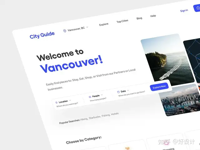 我们可以看得出,首先是slogan的设计就很不一样,先是一个黑的welcome to(副标题),再来一个,Vancouver(主标题)这样一个大小的对比,再来一个正文的灰色字体的对比,这一块就很出色。接下来是有几个位置,是有多少人入住了,有什么日期,进行选择,就是订房的三三三剑客,在下边,还有一个popular search。这一个,是比较热搜的一些关键词,也是用户体验的一种,再下来让我让用户来选择,我们要选的是哪一种服务,是餐饮,购物,还是酒店订房还是娱乐?