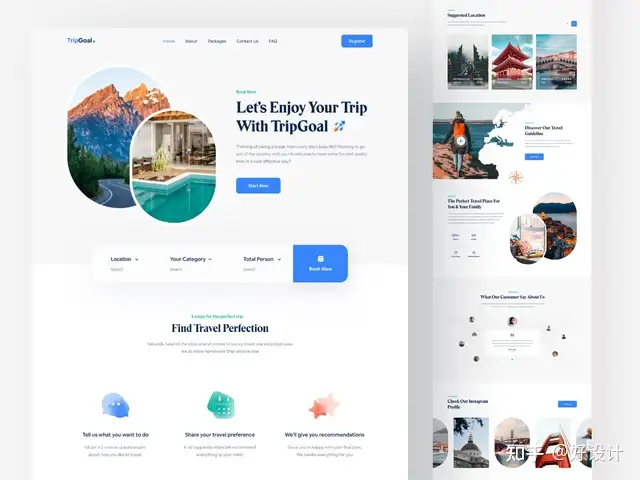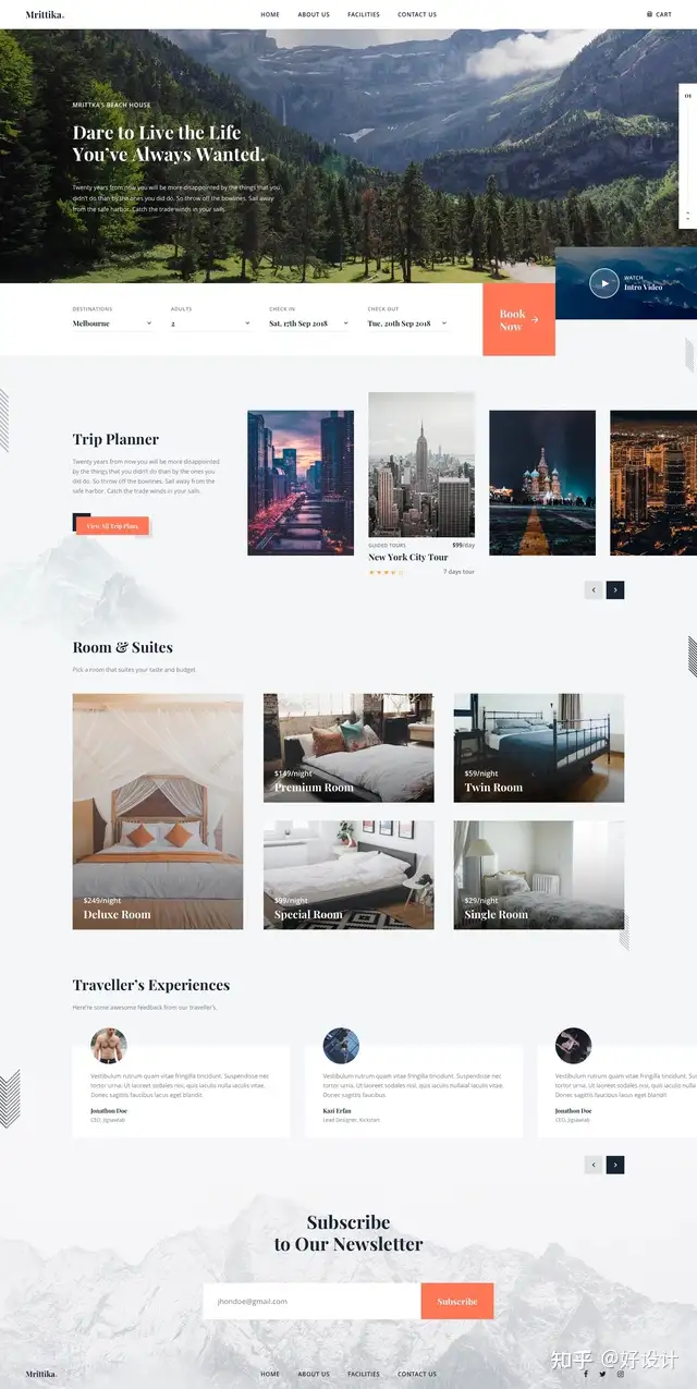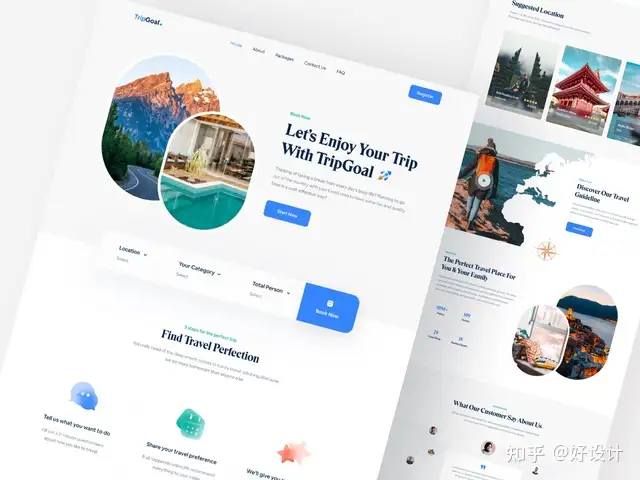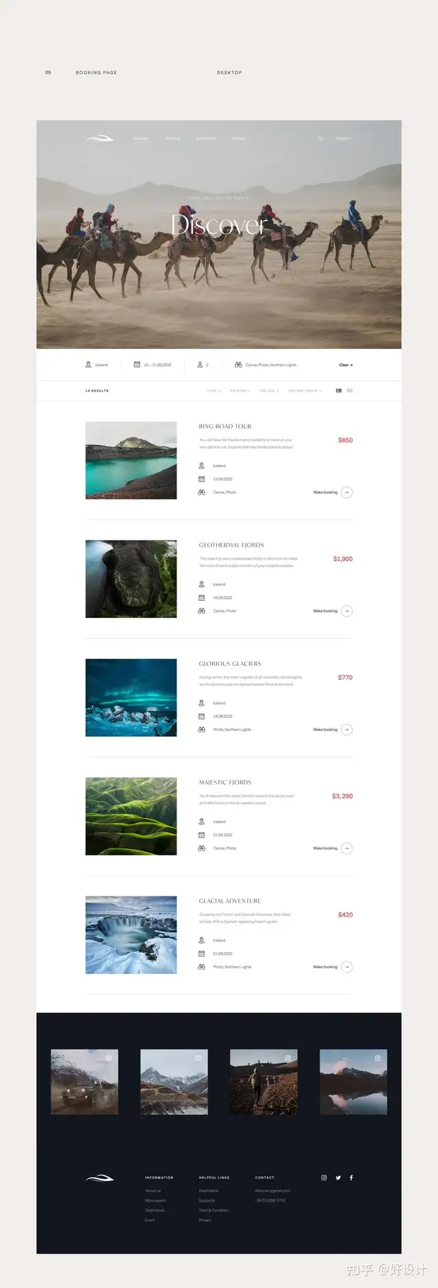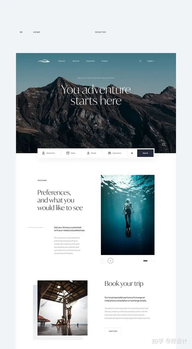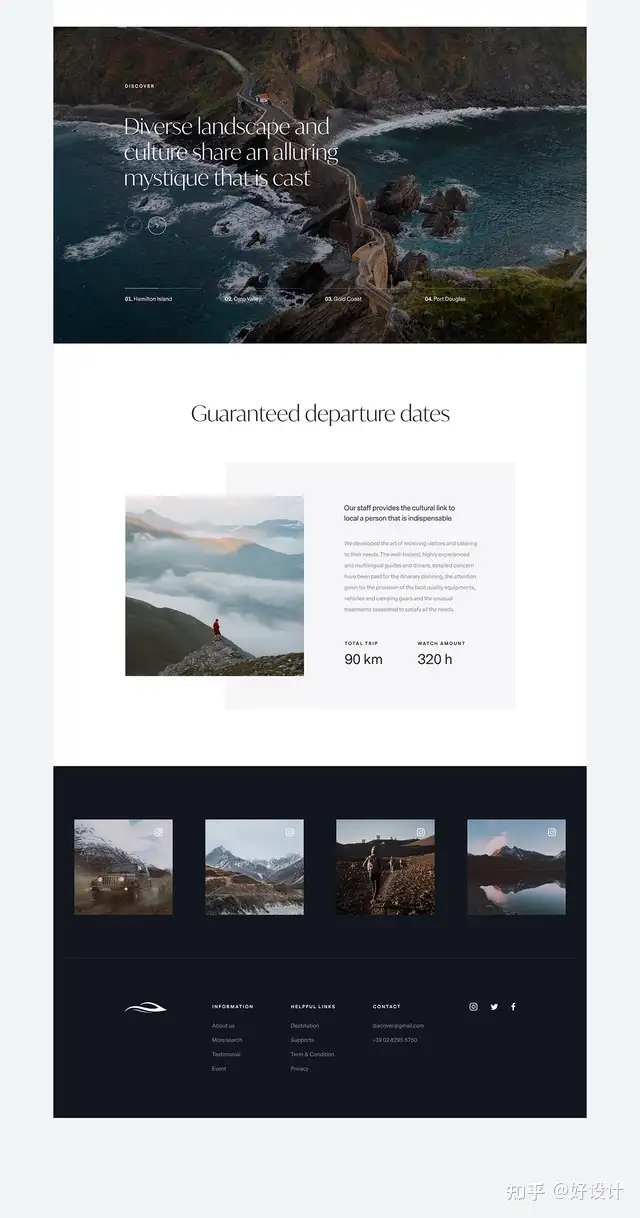 Monica这一个网站,大家看这个背景,能首先自己能猜测到这是做什么行业的吗?也是跟旅游相关的,因为这么大一个大自然的背景,后面这么精美的山,云,树林,哈很很明显,就是一个,生活的,探险的,旅游的一个氛围的。那这个网站的特点是什么,因为这个一看起来就是一个旅游的平台了,它的信息量会很大,在信息量很大的情况下,我们怎么布局这些信息?让它看起来既有成就感又不乱。