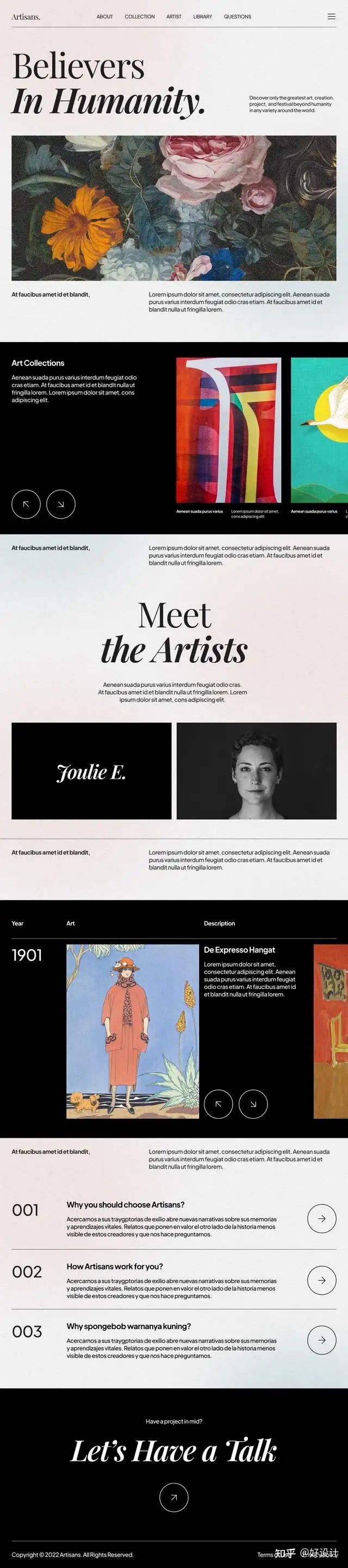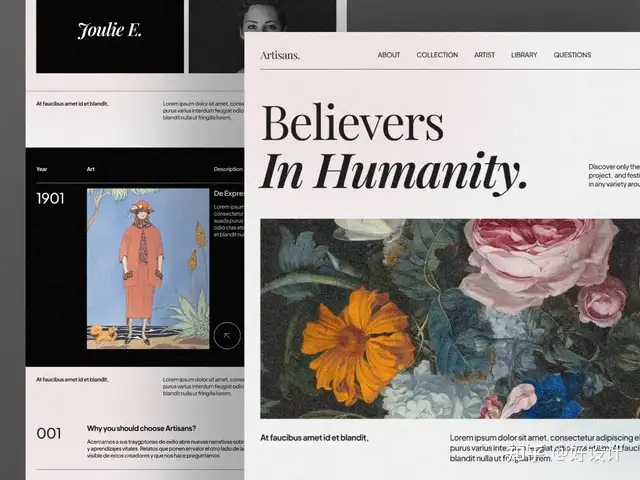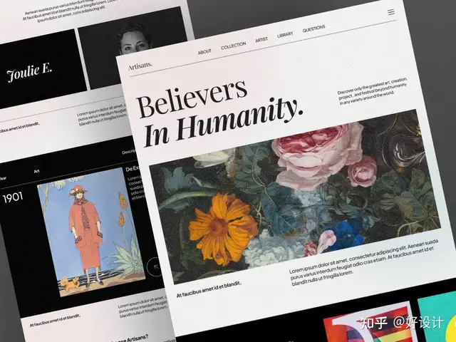 我第一次看到这一个作品,比较欣赏它,首先它这个布局,它不是完全按照电脑端的规格来去设计的,它既考虑电脑端,又考考虑手机端,它是这样子来做,所以它的布局,是用满屏的比例,这是第一点。第二点,它的菜单导航有一部分重要的是展示出来的,有一部分更多的服务,它放在汉堡菜单里边,第三。就是首屏里边,你会看到很多信息量,但是并不拥挤,比如说believers in humanity,就是一个大的slogan,右边要加一段小的文字,就形成一个强烈的对比,那下边要配一张比较比较,有艺术的这种绘图,这种插图,最后下面的两个内容又分的一分为二,就非常有艺术。