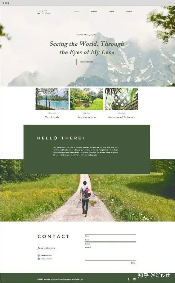 再下来,第二屏的后半部分就是介绍这个服务的,Hello there!,就有一段文字的背,这个地方,一个是文字的对齐方式很特别,第二个是这个背景色,就是logo的主色,这一块,它会压在第四第三屏的图片的上面,而且第三屏的图片上面又是以主绿色为主的,这样看起来就颜颜色的延展和连续性非常好。到最后一屏,就是用户的留言,也设计的非常,这个留留言表,设计的非常更。