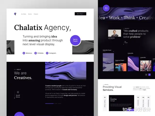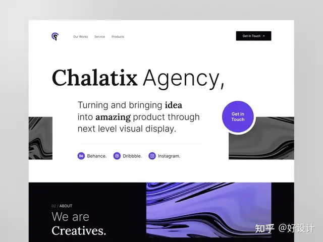 这个网站作品,非常吸引人,吸引地方有两点非常突出,首先就是布局,跟我们常见的不太一样,第二个是也就是板式,第二个是它的配色,一张图,它里面的波纹的这一张图跟一个圆圈的按钮,Getting touch有一个呼应,以及下面的小icon的颜色,这三个,地方是品牌色的布局,非常优秀,因为这都是来自logo。再到具体的地方,就比如banner区域的一些文字,大标题,小标题的对比,这个以前我们讲过非常好,大小对比。
