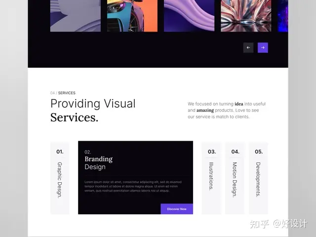 在第二屏里边,可以看得出这里用了一个油爆琵琶半遮面的手法,他就是用了互联网来进行滚动属性,右边只看到了内容的百分之10%,用户可以通过左边的箭头按钮来点击一样的情况,也可以通过拖拽鼠标,滚动屏幕的就看得到。这种是完除了平面设计之外,还考虑交互部分的出彩的地方。