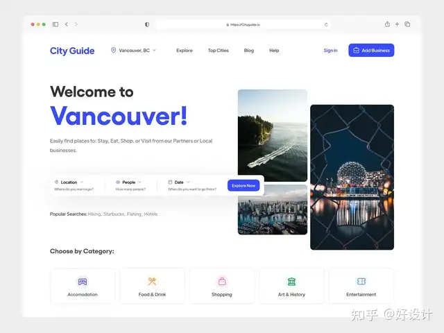 这一个网站案例,我们只看第一屏就能看得出设计师的设计能力,它包含它的版式设计、配色、图形运用以及对内容的主次的划分。非常有经验。我们先看页头,那页头,右上角有一个登登录入口和一个召唤按钮。Add Business就是用户要做任务的,Logo旁边,还有一个城市的选择,这些都是功能型的组件,再下来,第二屏,跟我们往常看到的那一些全屏banner全屏图片,这种风格有很大的差异。